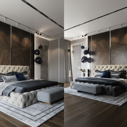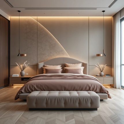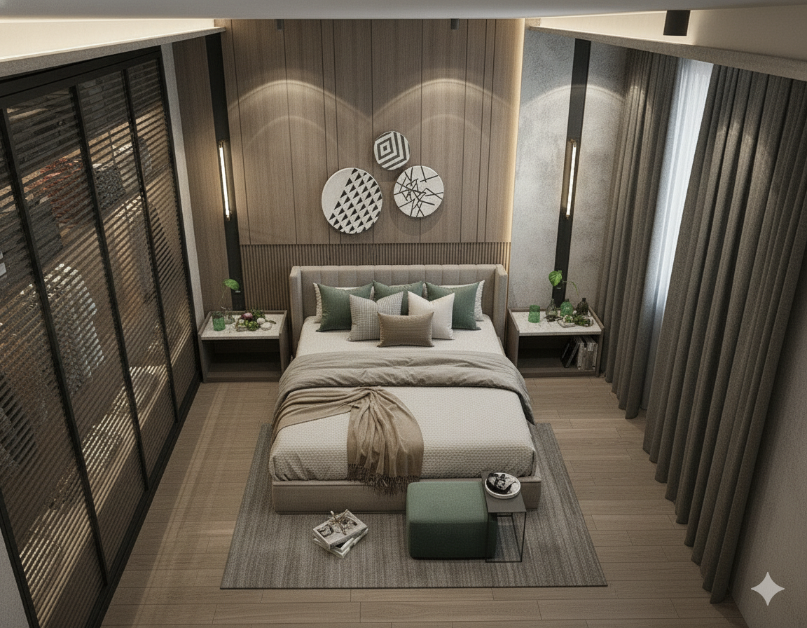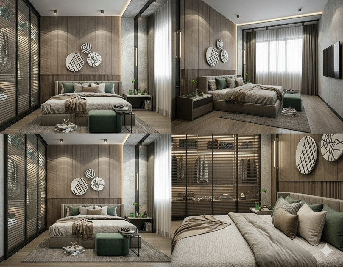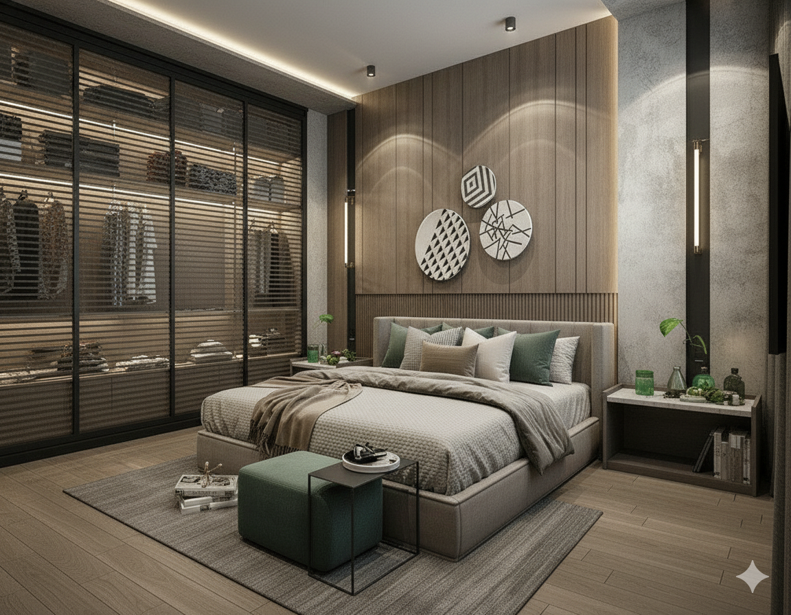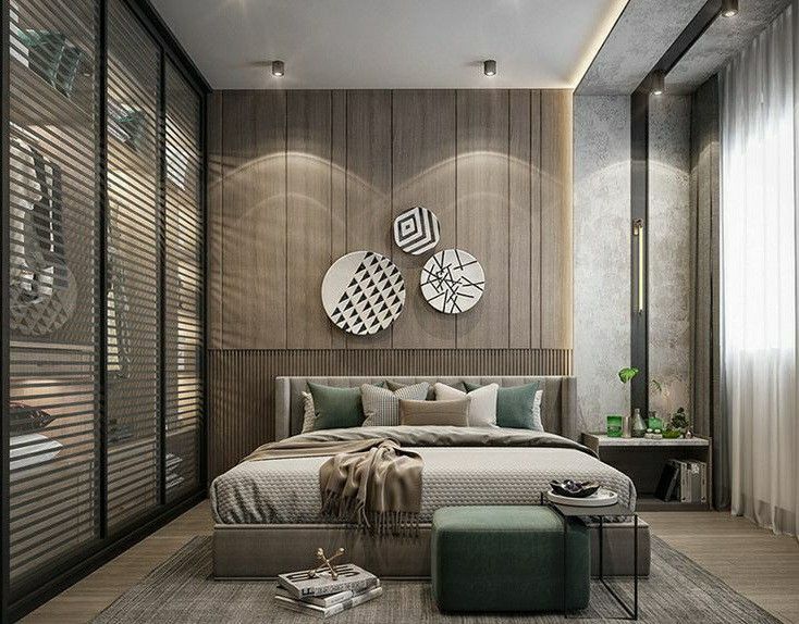 غرفة نوم مودرن راقية تتميز بجدار خلفي بتفاصيل خشبية عمودية ولوحات فنية دائرية هندسية تمنح المكان عمقاً وبُعداً بصرياً. تصميم الغرفة يعتمد على لوحة ألوان ترابية دافئة مع لمسات خضراء لإضافة حيوية. تحتوي على سرير مبطن منخفض، ووحدة تخزين جانبية، وشفونيرة بباب زجاجي مخطط، مع توزيع إضاءة سبوت وLED لتوفير أجواء هادئة ومريحة. التصميم يمزج بين الحداثة والدفء الطبيعي بشكل متوازن وعملي