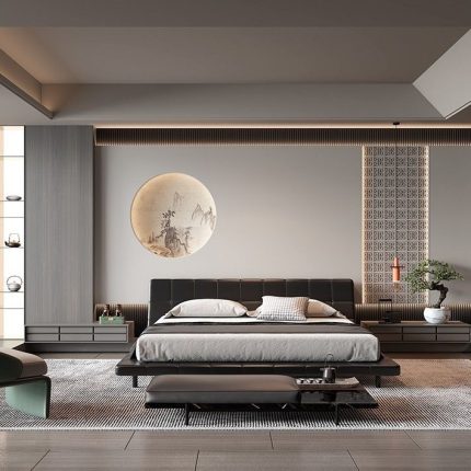 السرير مبطن بالكامل بتصميم منخفض يعزز الإحساس بالراحة والهدوء، ويقع فوق سجادة مربعات أنيقة.