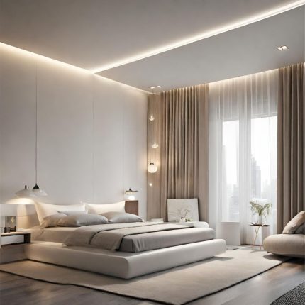 الإضاءة عبارة عن ليد مخفي سقفي يحيط بالغرفة بالكامل، بالإضافة إلى وحدات إضاءة نحتية Organic Sculptural Pendants تمنح لمسة فنية فريدة.