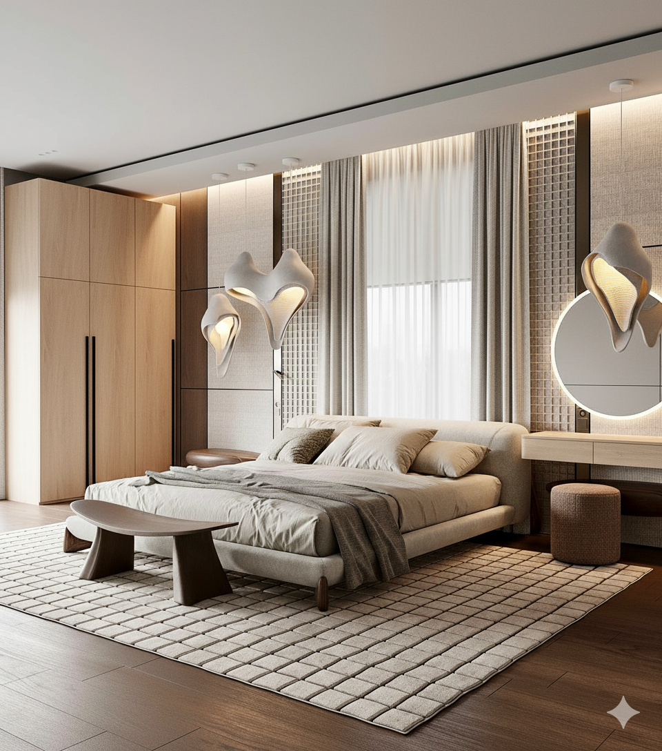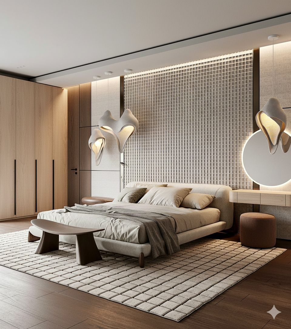غرفة نوم بتصميم مودرن أورجانيك فاخر تعتمد على درجات البيج والرملي والخشب الطبيعي، مع خلفية مميزة خلف السرير من خامات ثلاثية الأبعاد “3D Grid Panels” مدمجة مع ألواح خشبية فاتحة.