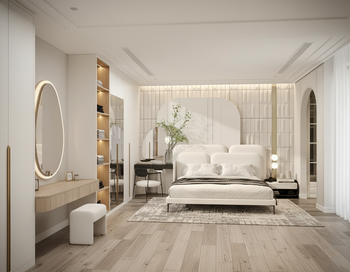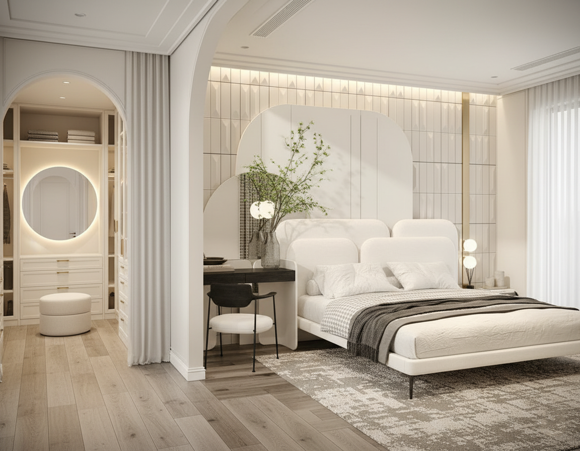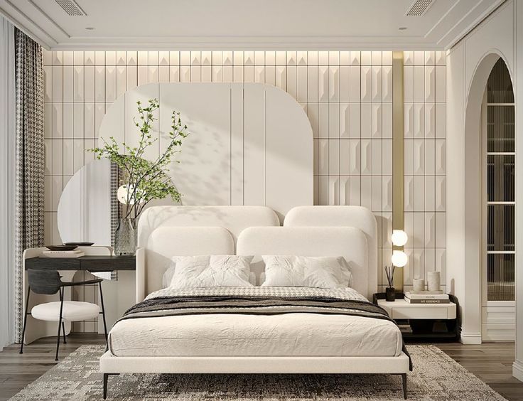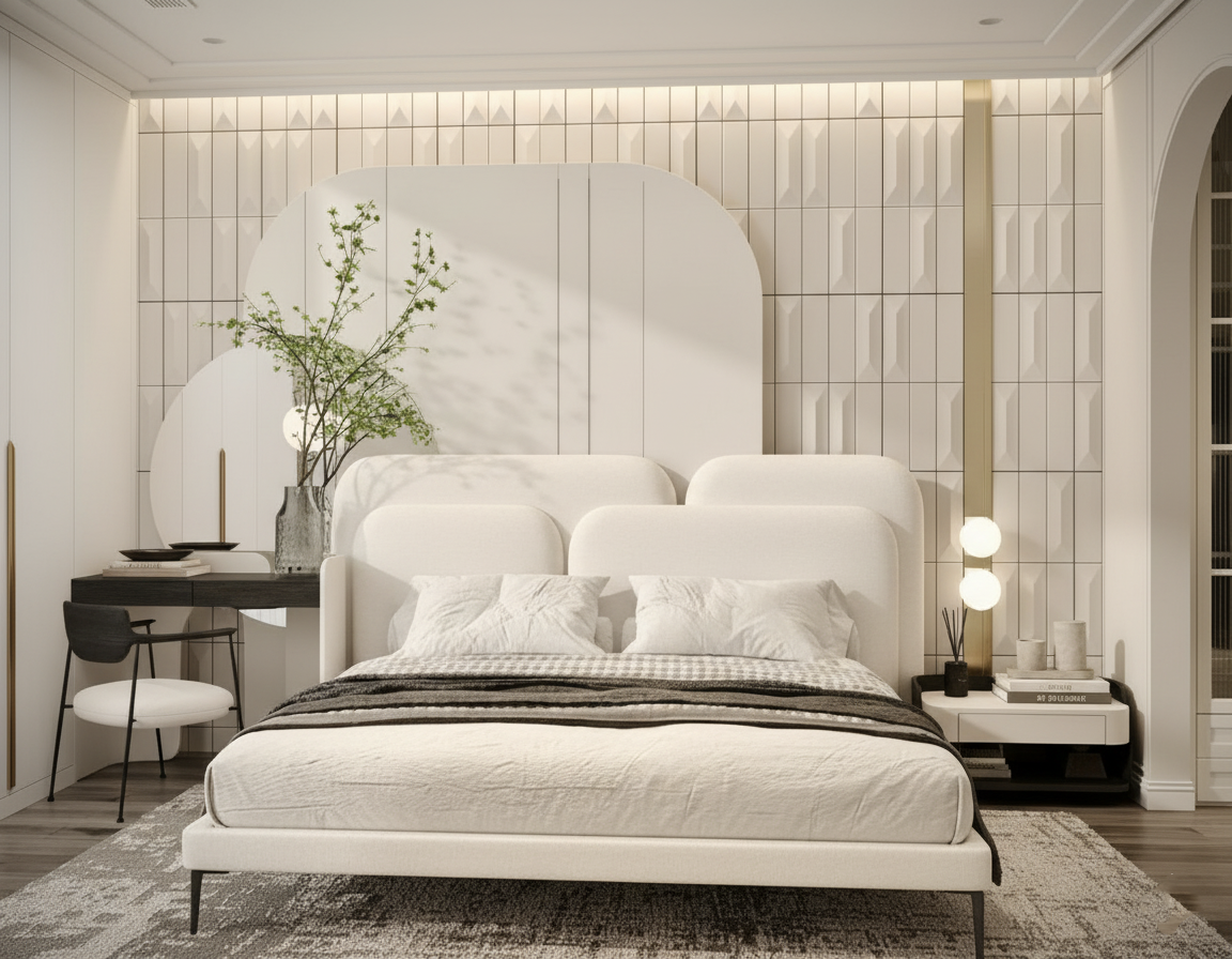 غرفة نوم مودرن فاخرة باللون الأبيض بتصميم هندسي ثلاثي الأبعاد، سرير مبطن مريح، وإضاءة LED مخفية تضيف أجواء راقية وهادئة. مناسبة لغرف النوم الرئيسية والشقق الراقية.