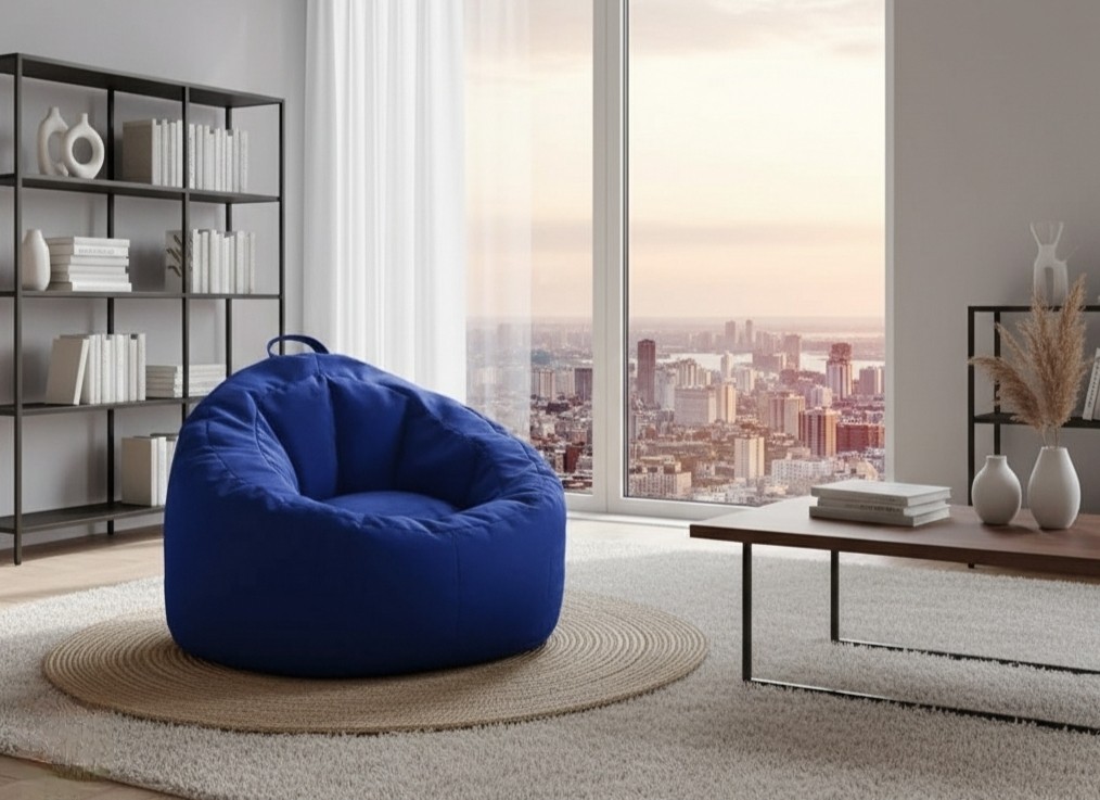 كرسي بين باج لاونج مريح من القماش باللون الأزرق، يضفي لمسة عصرية وحيوية على غرفة المعيشة أو غرفة النوم مع إحساس ناعم بالاسترخاء.
