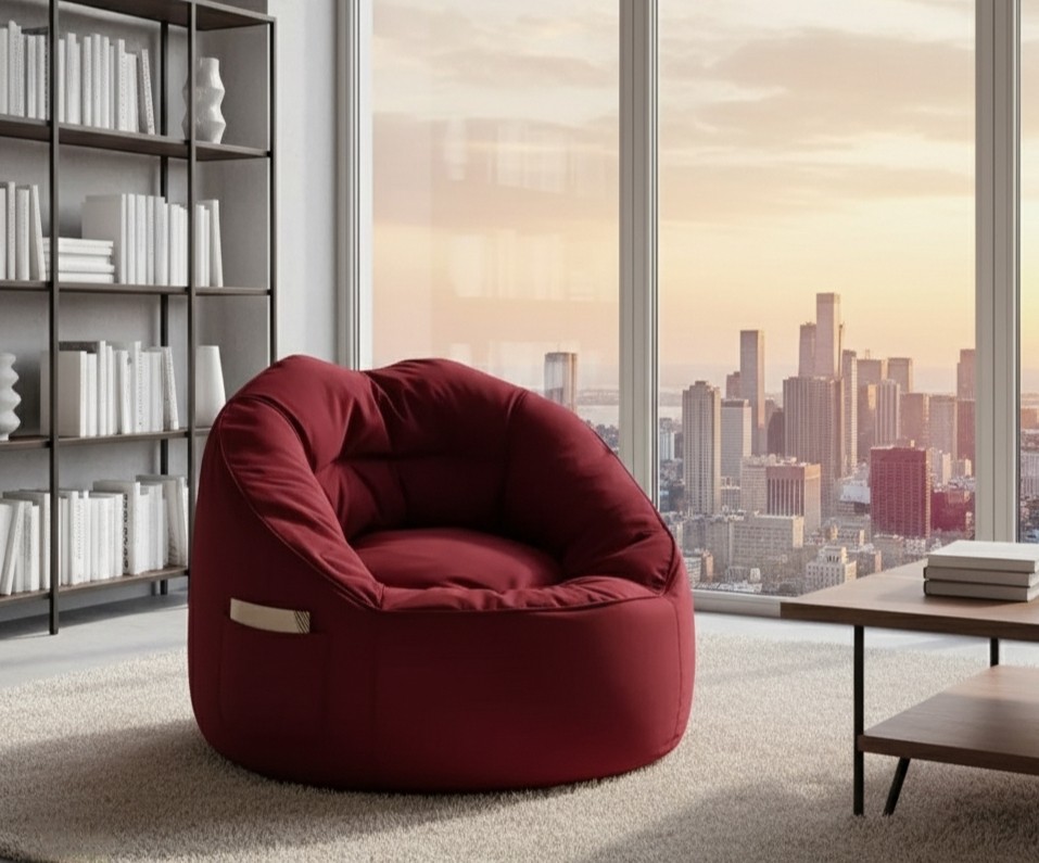 كرسي بين باج لاونج مريح من القماش باللون الأحمر، بتصميم يحتضن الجسم ليمنح إحساسًا دافئًا للاسترخاء في غرفة المعيشة أو غرفة القراءة.