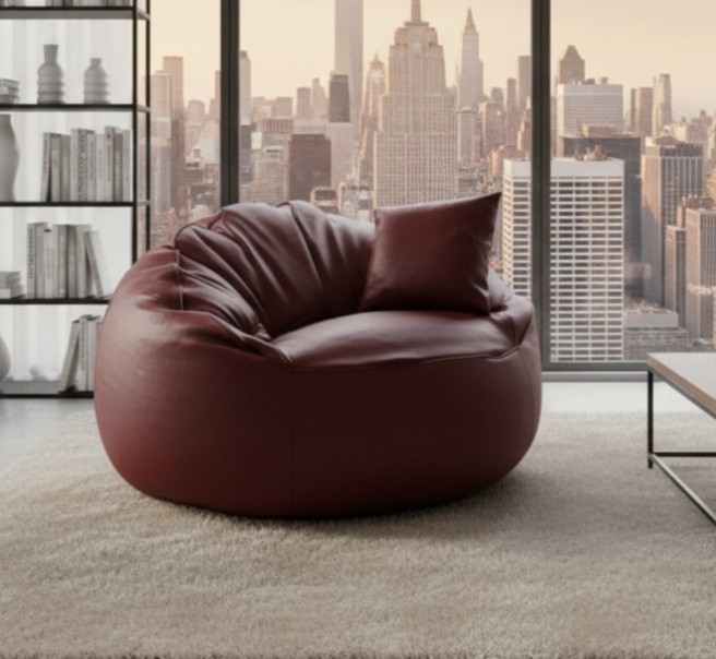 • كرسي بين باج لاونج فاخر من الجلد باللون الأحمر الداكن، يمنح إحساسًا أنيقًا وعصريًا يناسب غرف المعيشة والمساحات المفتوحة ذات الإطلالة البانورامية.​
