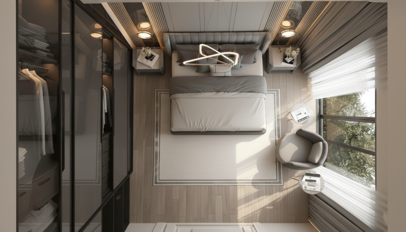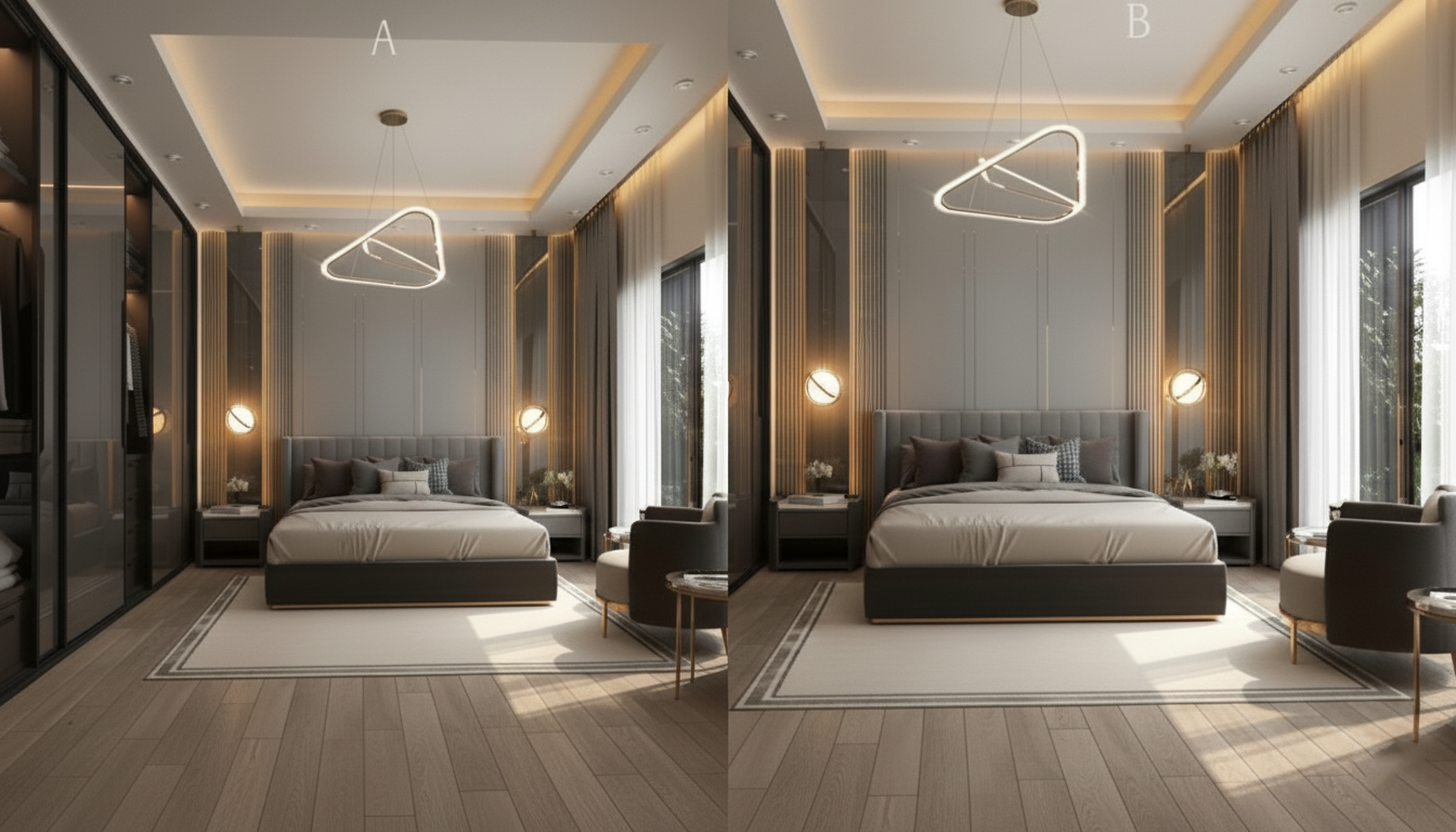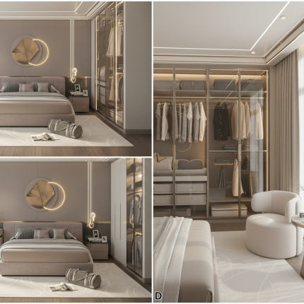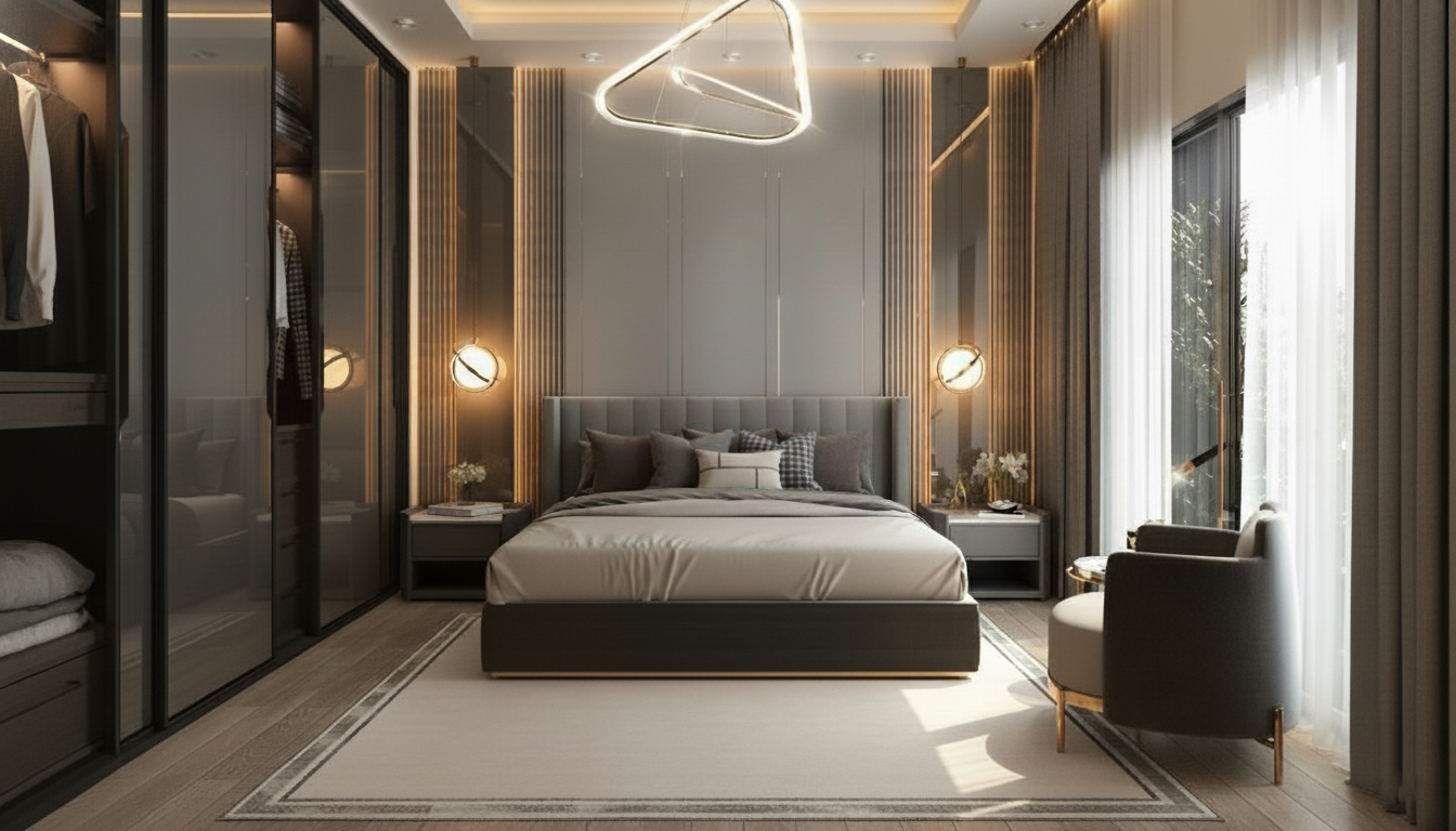 غرفة نوم ماستر مودرن بتصميم فاخر يجمع بين البساطة والأناقة. تتميز الجدران بألواح ديكور رأسية مضاءة بإضاءات مخفية، مع سرير رئيسي بتنجيد ناعم ولون محايد يمنح الإحساس بالراحة. تأتي المساحة مزودة بنظام تخزين مخفي داخل دولاب زجاجي داكن وإضاءة داخلية دافئة، إضافة إلى كرسي استرخاء قرب الشباك يضيف لمسة راقية. الإضاءات المعلقة ذات التصميم الهندسي تجعل السقف نقطة جذب أساسية في الغرفة.