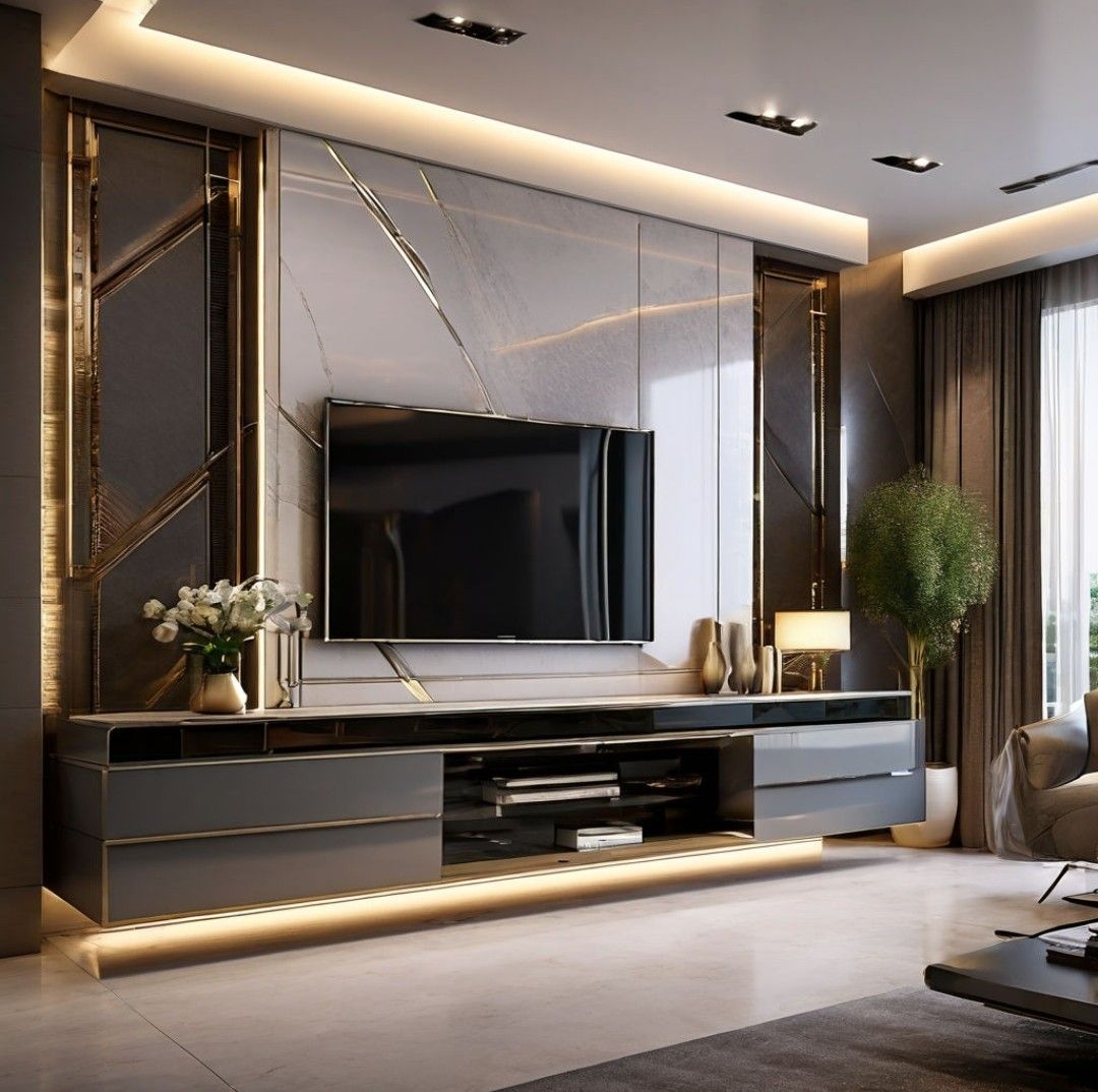 هو يونيت تلفزيون فخم وعصري، يتميز بتصميم جداري أنيق من الرخام والمعدن اللامع يحيط بالشاشة، مع إضاءة مخفية تبرز التفاصيل. أسفله توجد وحدة تخزين عائمة بلون رمادي داكن مع لمسات ذهبية وإضاءة سفلية، توفر أدراجًا وأرففًا لوضع الأجهزة والإكسسوارات.