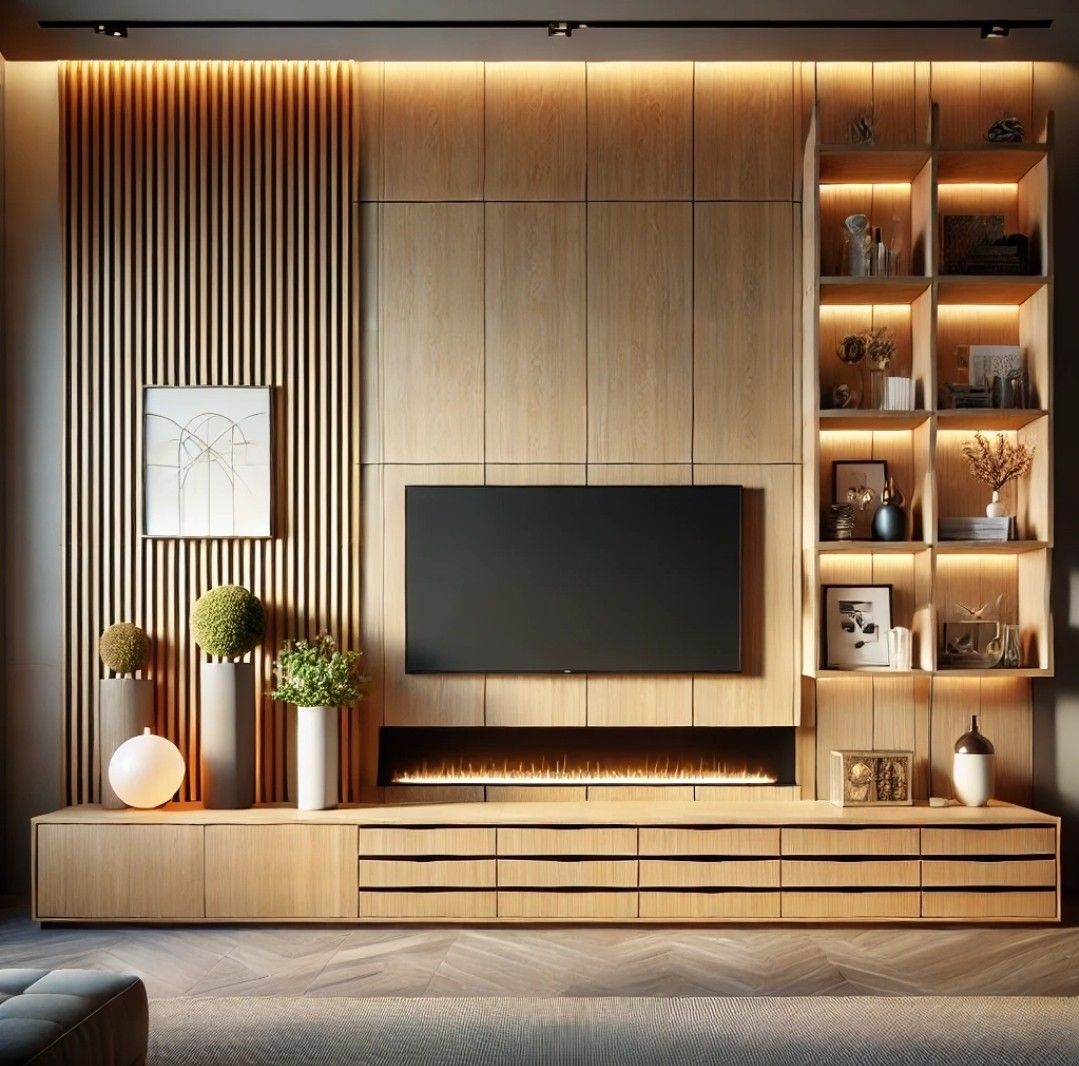 وحدة تلفزيون خشبية فاتحة بتصميم حديث تجمع بين اللوحات العمودية والرفوف المضاءة بشكل أنيق. تتميز بإضاءة LED دافئة ومدفأة ديكورية تضيف لمسة فخامة للمساحة، مع وحدات تخزين واسعة تساعد في تنظيم غرفة المعيشة. تصميم مثالي للمنازل العصرية التي تبحث عن الجمال والعملية.