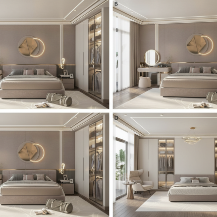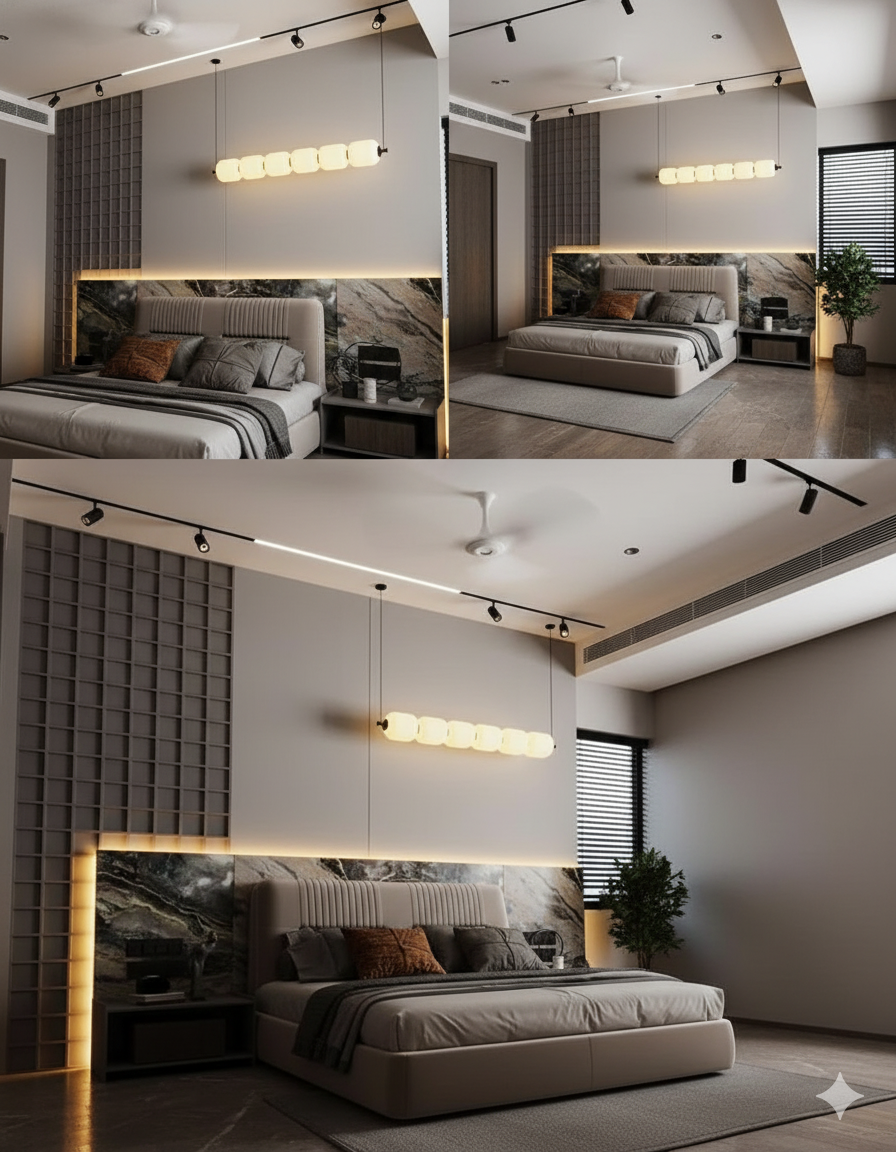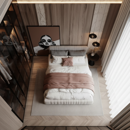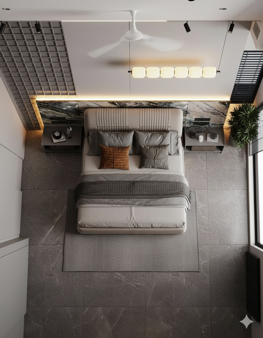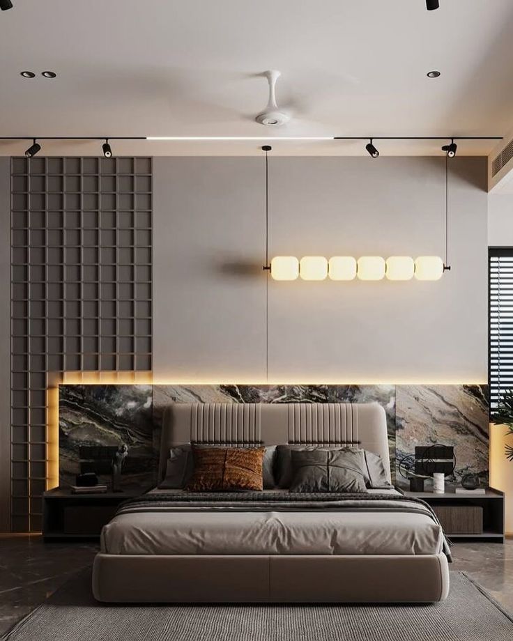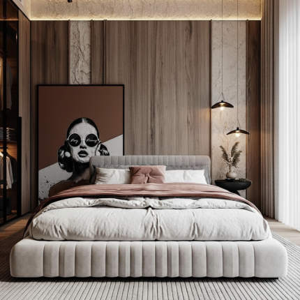 يأتي السرير بتنجيد مبطن فاخر مع تنسيق ألوان رمادي وذهبي، بينما يتناغم رخام الأرضية الأبيض بخطوط الرمادي ليعطي لمسة راقية. الإضاءة الجانبية المعلقة تضيف عمقاً للمشهد وتبرز جودة الخامات.