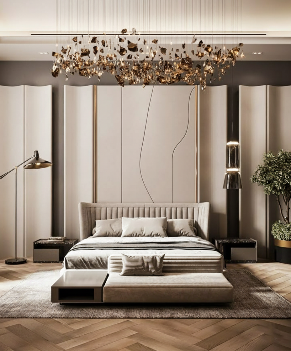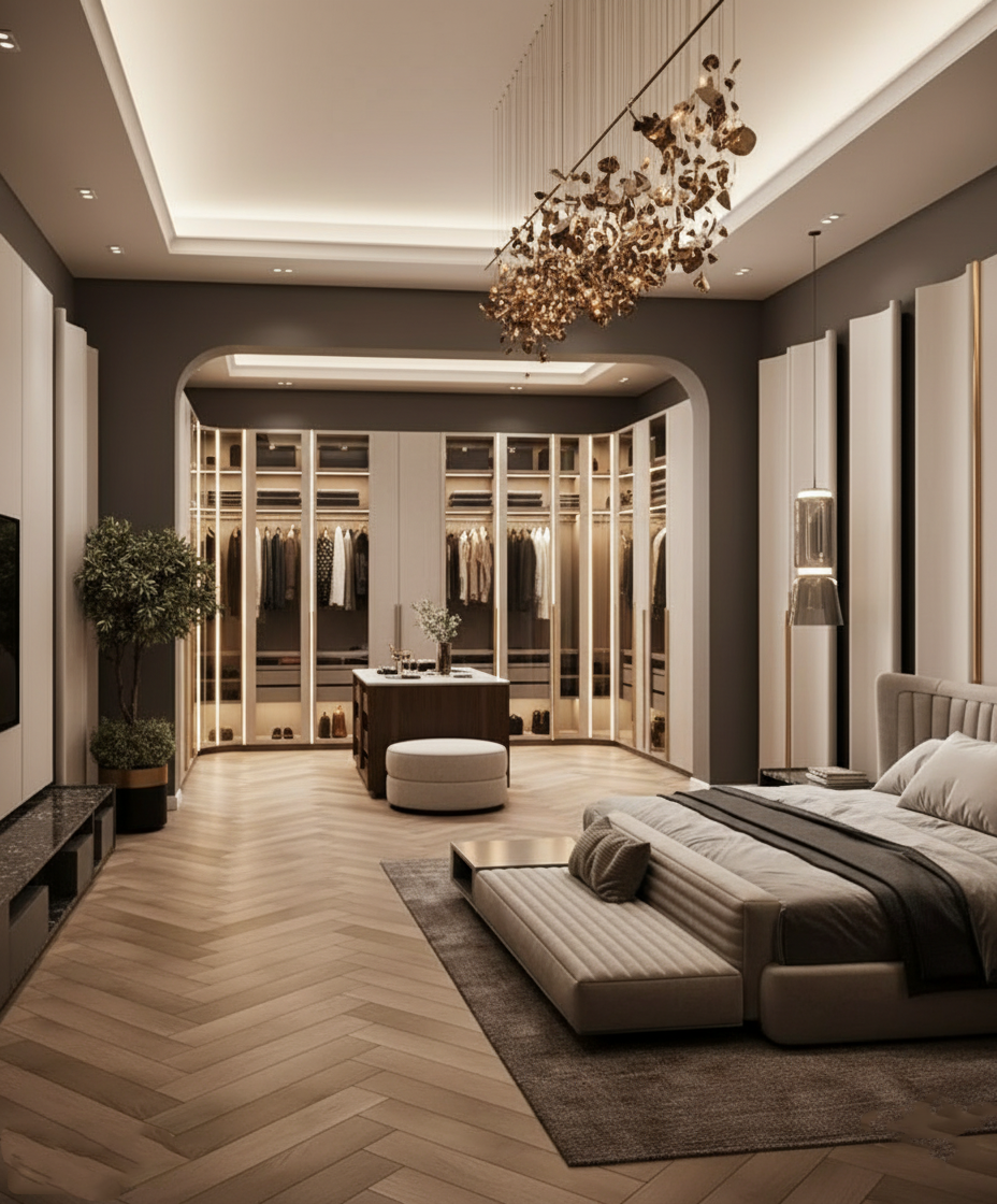 غرفة نوم ماستر فاخرة بتصميم عصري دافئ، تتميز بسقف جبسي بإضاءة مخفية، وأرضية باركيه بنقشة متعرجة، ونجفة فنية معلّقة بتفاصيل معدنية ذهبية. تضم الغرفة منطقة ملابس واسعة بإضاءة مدمجة تمنح مظهراً فاخراً، بالإضافة إلى سرير بتنجيد مخملي وجلسة أمامية عملية. مزيج الألوان الهادئة والخامات الراقية يخلق مساحة مثالية للاسترخاء والفخامة.